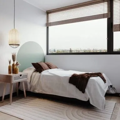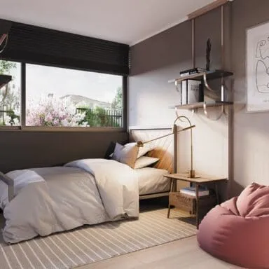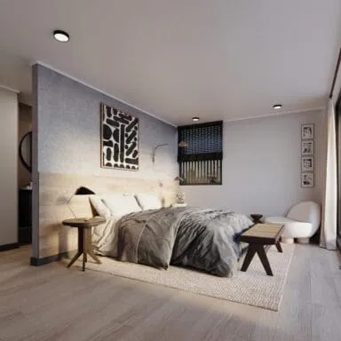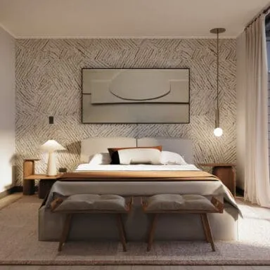 Amplios y luminosos dormitorios con amplias ventanas que aportan luz natural y una paleta de colores cálidos que invitan a relajarse, ideal para hacer de la habitación un lugar de descanso.